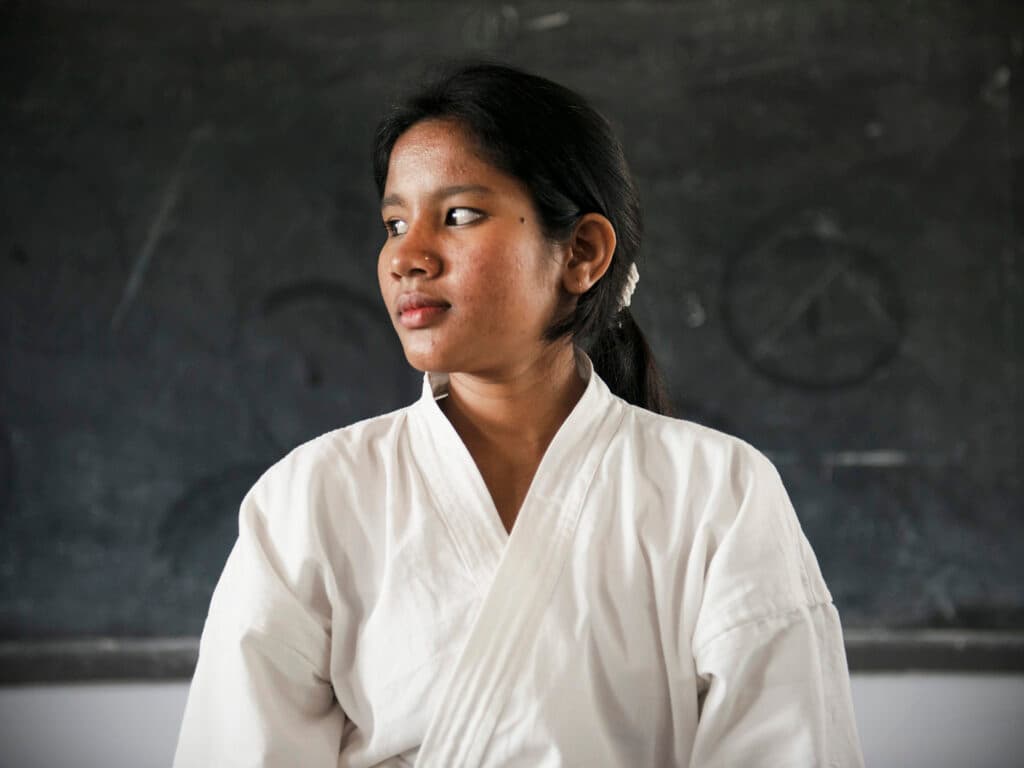 “Now that I’m doing karate, I have the courage to talk to everyone. If a boy is disturbing me, I tell him so. Girls who don’t do karate are scared, but not me. The training makes us bold and independent. We can defend ourselves and others.”