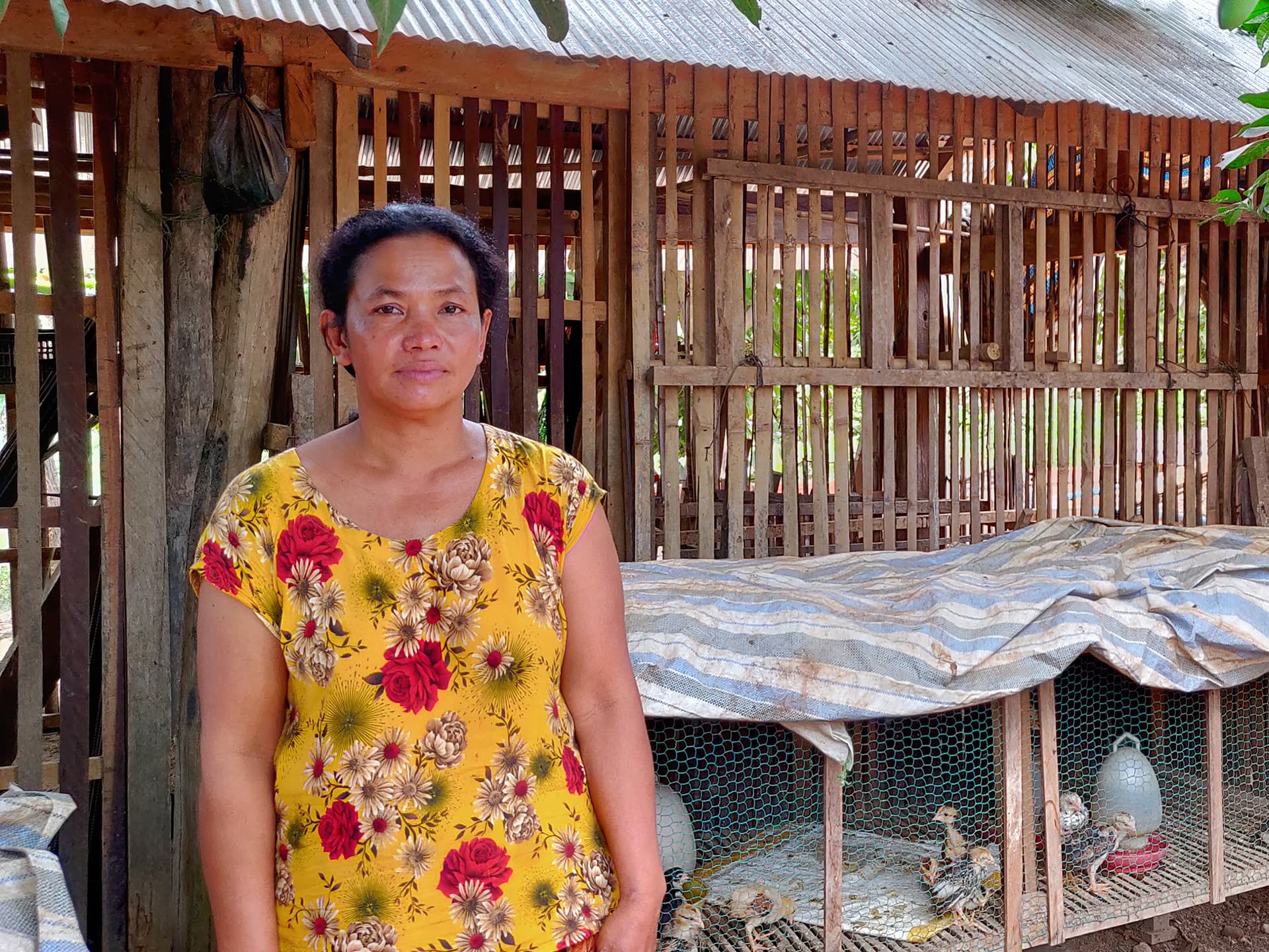 Chim Sophat is a widowed single mother with two children from Kratie province, Cambodia. She lives in a small house in Pramar village, surrounded by large rubber orchards. Her primary income comes from day-to-day work for the rubber company, earning around USD 120 a month. However, this income is unstable since it depends on available work when the company needs workers to harvest and collect liquid rubber. No other jobs are available in her village.