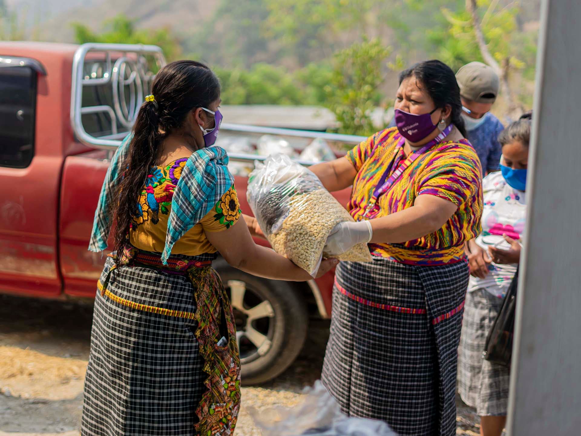Se proporcionan maíz, arroz, frijoles, aceite, pasta, mantequilla, azúcar, sopas y una mascarilla en un paquete que se distribuyen a las mujeres pertenecientes a la población indígena kaqchikel. El paquete de alimentos puede apoyar hasta cinco personas durante una semana. Es un esfuerzo agudo que hace una verdadera diferencia y que busca mitigar el impacto socioeconómico de la crisis.