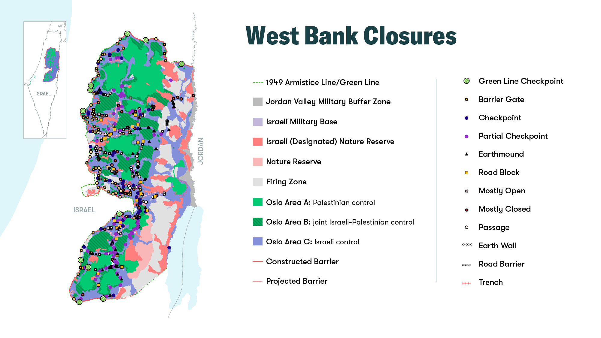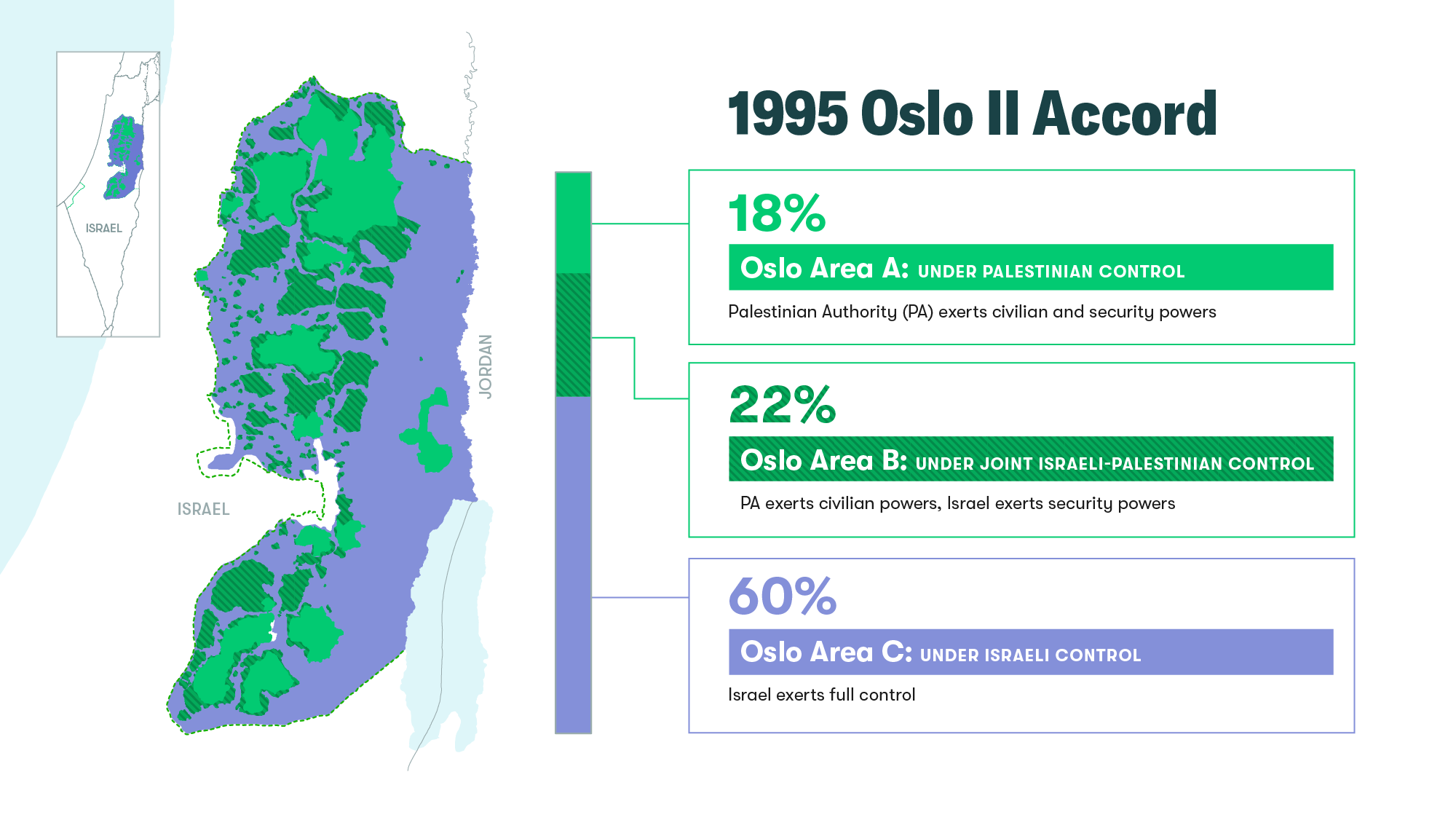 On 28 September 1995, the Israeli-Palestinian Interim Agreement on the West Bank and the Gaza Strip (the “Oslo II Accord”) is signed, which divides the West Bank into Areas A, B and C. The PA is to exert civilian and security powers over Area A – the major Palestinian population centres – while Israel retains security control over Area B and full control over Area C. Albeit envisaged as a temporary arrangement, the division into Areas A, B and C persists to this day, and with it the multitude of checkpoints and permit requirements that restrict Palestinians’ freedom of movement.