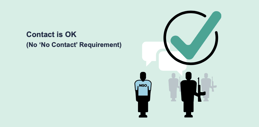 No such prohibition exists. Indeed, such a prohibition would conflict with international humanitarian law. Common Article 3 of the Geneva Conventions expressly foresees the possibility for humanitarian actors to offer their services to both sides in non-international armed conflicts — states and organised armed groups. This implicitly recognises the possibility of liaising with such groups, even if they are designated under counterterrorism measures, as do other rules regulating humanitarian operations in non-international armed conflicts.