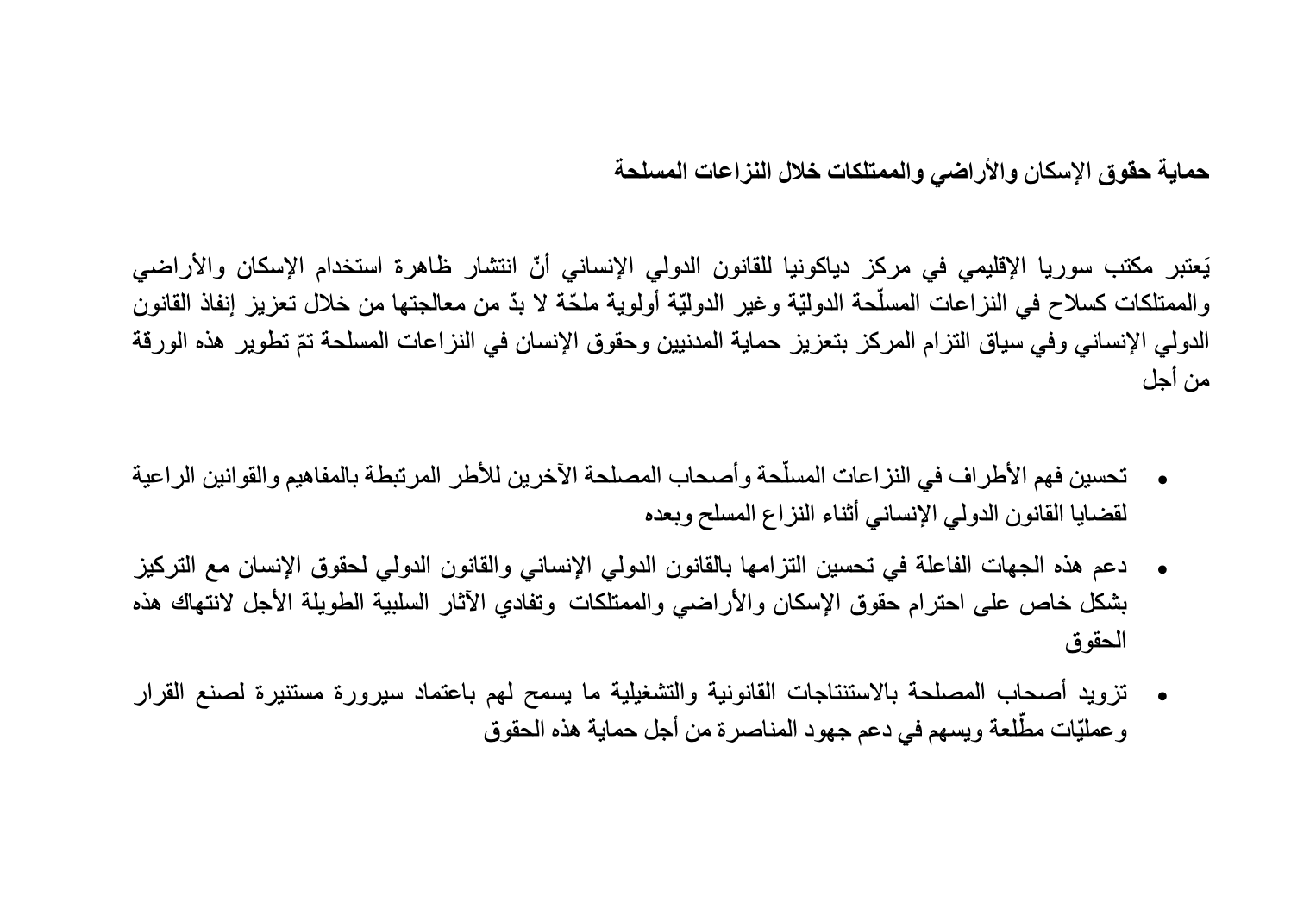 حماية حقوق الإسكان والأراضي والممتلكات خلال النزاعات المسلحةThe Syria Regional Desk at the Diakonia International Humanitarian Law Centre considers the widespread phenomenon of weaponizing housing, land, and property (HLP) in international and non-international armed conflict (IAC-NIAC) as an urgent priority that requires enhanced enforcement of international humanitarian law (IHL). In the context of the Centre’s commitment to improving civilian protection and human rights in armed conflict, this paper was developed to: