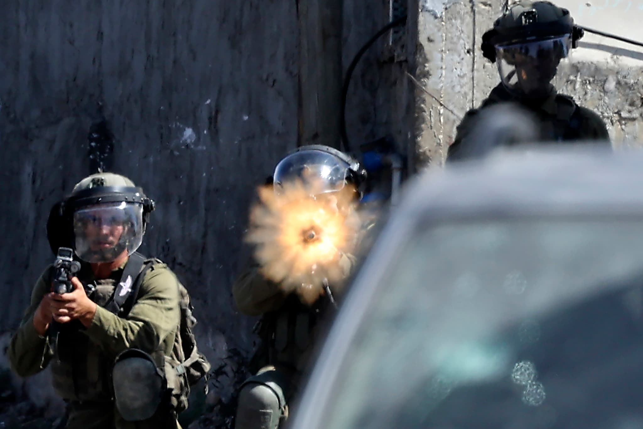 PHOTO: ISRAELI SOLDIERS TAKE POSITION AMID CLASHES WITH PALESTINIAN DEMONSTRATORS FOLLOWING A PROTEST AGAINST THE EXPROPRIATION OF PALESTINIAN LAND BY ISRAEL IN THE VILLAGE OF KFAR QADDUM IN THE OCCUPIED WEST BANK, NEAR THE JEWISH SETTLEMENT OF KEDUMIM, ON 30 SEPTEMBER 2022. AFP/JAAFAR ASHTIYEH