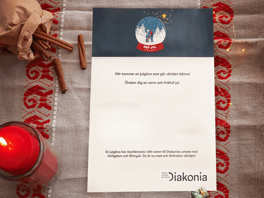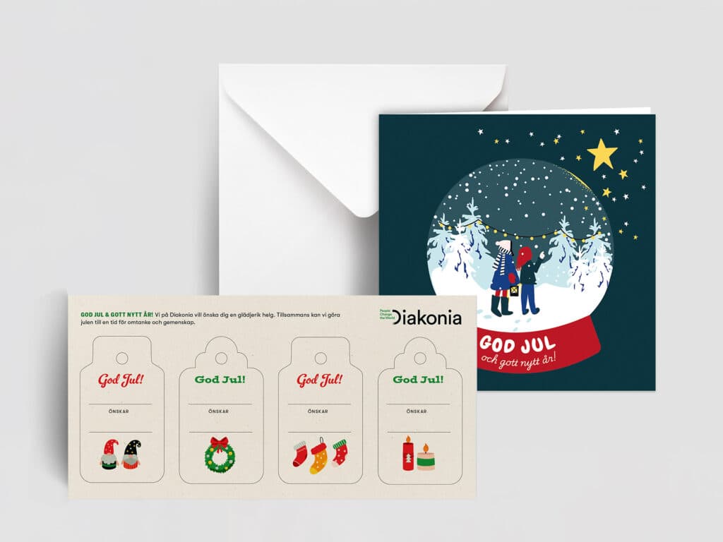 I årets julshop finns bara sådant som världen behöver just nu. Välj mellan Diakonias fysiska julkort som säljs i fempack, våra juletiketter eller ett digitalt gåvobevis som laddas ner direkt.